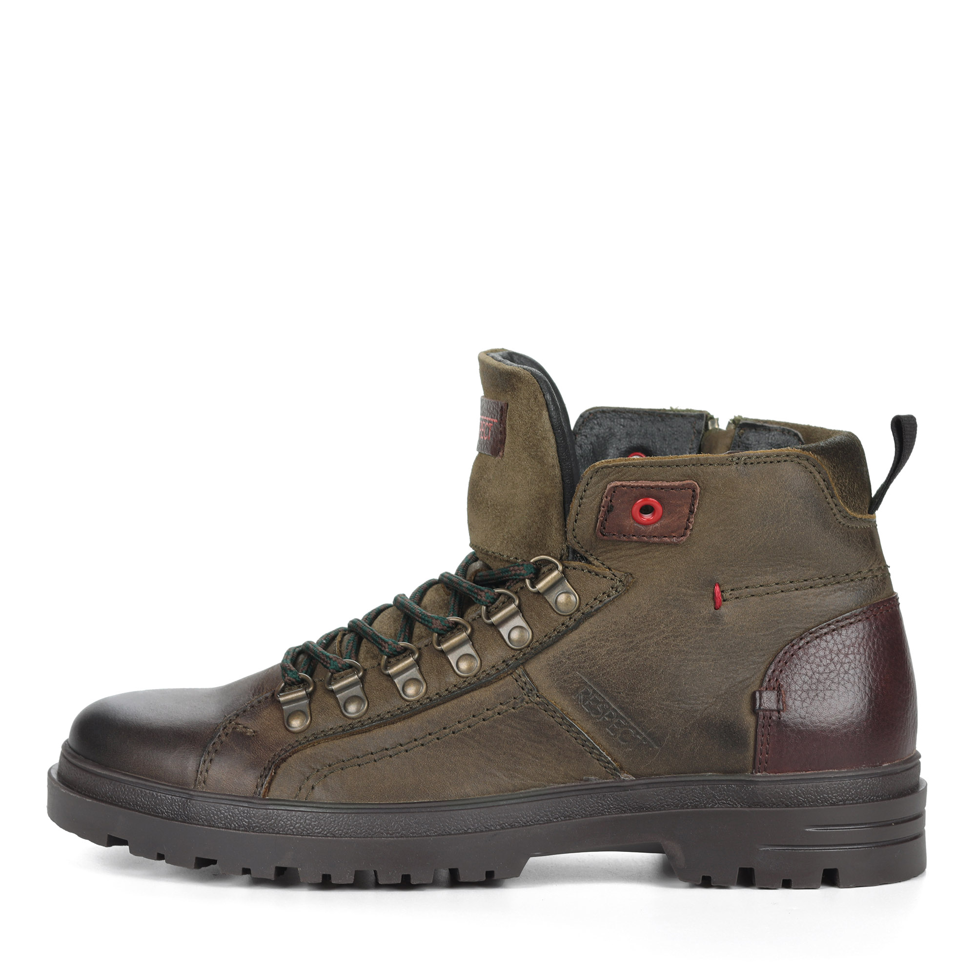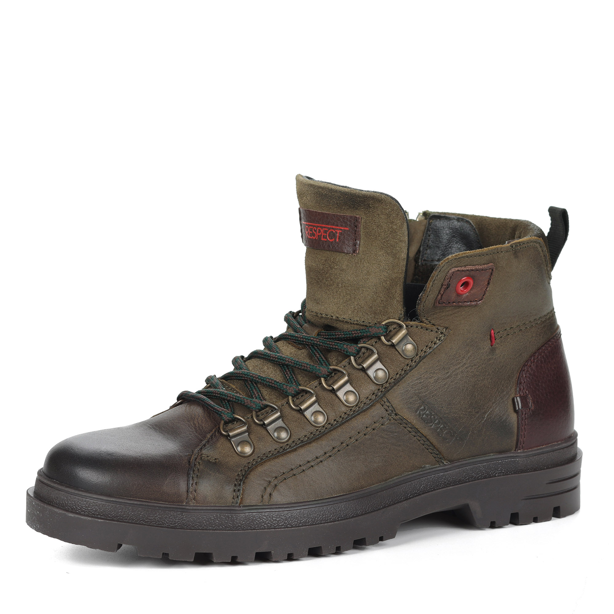 Ботинки из кожи в цвете хаки Respectнепременно станут любимой парой поклонников стиля, в основе которого находится повседневный комфорт. Демисезонная обувь сочетается со множеством мужских образов, которые могут быть подобраны на каждый день. Натуральная кожа выступает в роли основного материала, из которого изготовлены ботинки. Их дополняет текстильная подкладка и стелька. Что касается подошвы, то она сделана на основе полиуретана. Материал не перегружает ногу лишним весом и характеризуется износостойкостью. Поэтому такая пара прослужит не один сезон. Демисезонные ботинки на весну и осень выполнены в коричневом цвете. Они привлекают внимание оригинальным сочетанием разных текстур. Модель имеет универсальную шнуровку. Также предусмотрена молния для удобного обувания пары. Рифление на подошве решает проблему скольжения ног во время ходьбы.